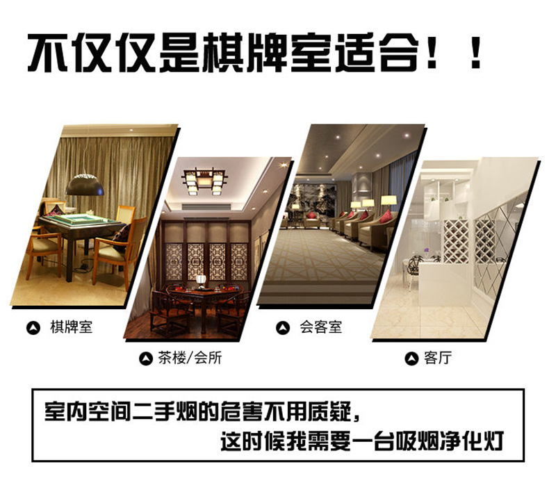 棋牌室、吸煙室、茶樓等場所除二手煙、除塵、除異味、裝飾、照明用。