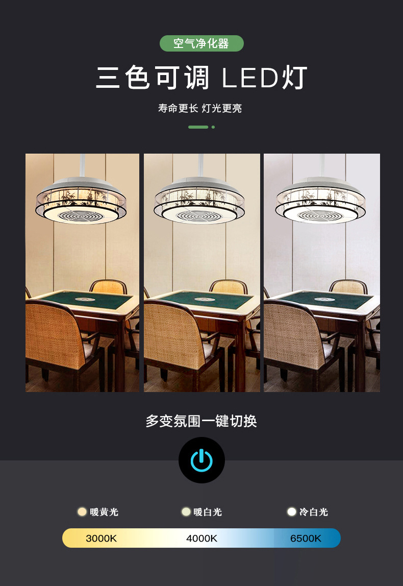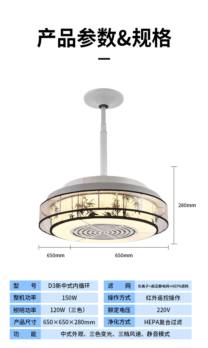 【功能】中式外觀、三色變光、三檔風速、靜音模式